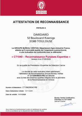 Depuis 2025 l’entreprise Dardard est certifiée par le Bureau Véritas, sous présence et validation par un huissier de justice, pour la RECONNAISSANCE PUNAISE EXPERTISE. Le plus haut niveau de reconnaissance dans la détection canine des punaises de lit. Cette certification a été attribuée pour deux maîtres chiens ainsi que les chiens Ula et Urios.