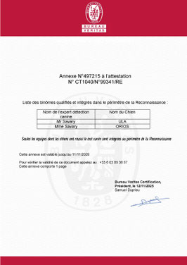 Audit par Bureau Veritas: La reconnaissance est obtenue après un audit indépendant réalisé par Bureau Veritas, vérifiant que l'entreprise et ses équipes (expert et chien détecteur) respectent les critères du cahier des charges.