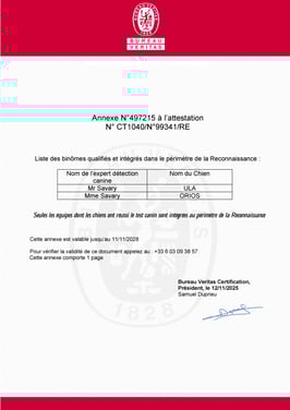 Audit par Bureau Veritas: La reconnaissance est obtenue après un audit indépendant réalisé par Bureau Veritas, vérifiant que l'entreprise et ses équipes (expert et chien détecteur) respectent les critères du cahier des charges.