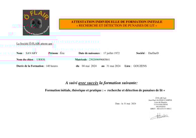 Chez Dardard, nous avons choisi de faire appel aux compétences de formation de la société O-Flair pour former Urios et Ula à la détection des punaises de lit sur une formation de 1 mois pour la formation initiale qui à eu lieu en mai 2024. Les chiens font des entrainements réguliers chaque semaine, en plus des détections de terrain et un recyclage chez O-Flair est prévu chaque trimestre. Le but étant d’entretenir des binômes Chien/Maître chien avec des compétences actualisées, mais surtout qui sont vérifiées par un tiers indépendant.