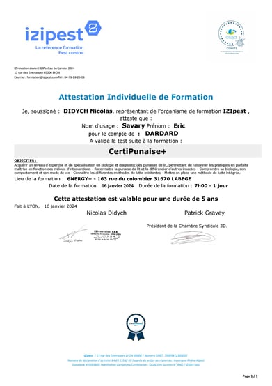 C’est une certification attestant une formation sur les punaises de lit. Dans cette formation on y apprend à identifier les punaises à tous les stades (oeuf, juvénile, intermédiaire et adulte) mais également leur comportement. C’est une formation indispensable afin d’être référencé par le ministère du logement et de la transition écologique.