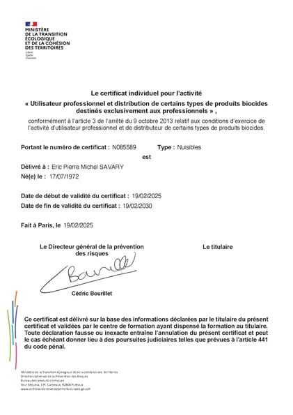 Certificat Certibiocide du gérant